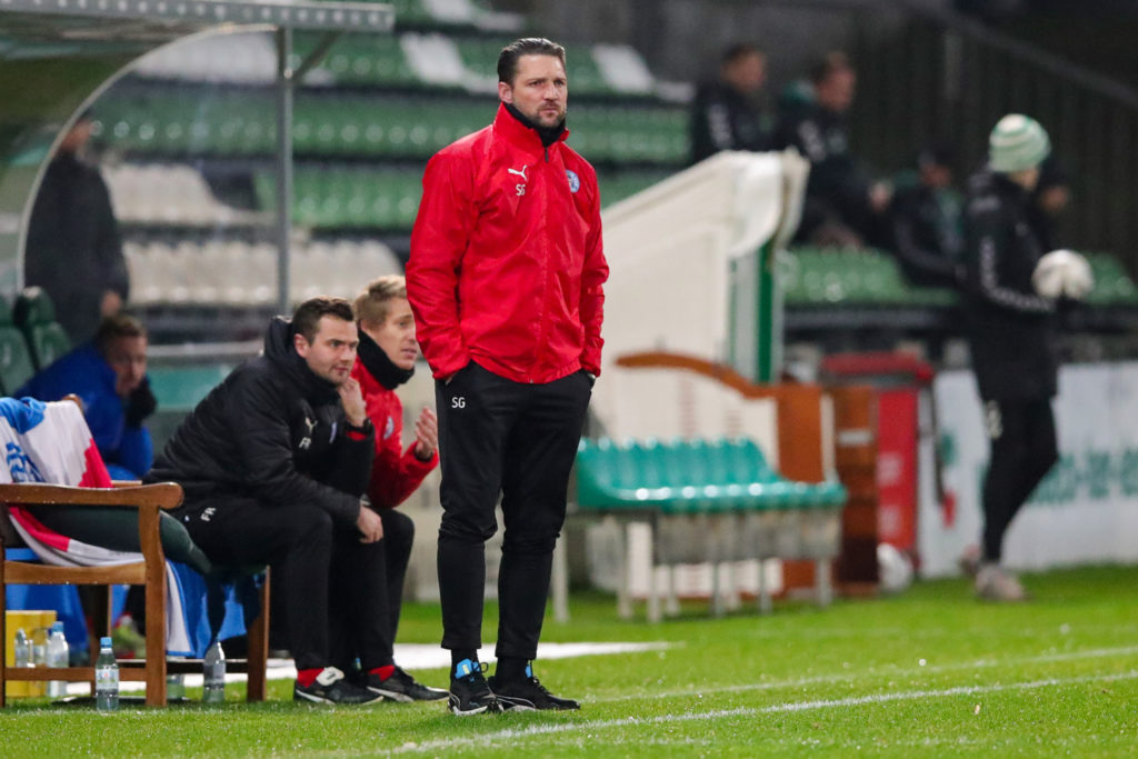 Lübeck – Sebastian Gunkel sagte nach der 0:2-Niederlage seiner Mannschaft am Freitagabend in der Pressekonferenz: „Glückwunsch an den Gegner, das gehört sich, dass man den Sieger beglückwünscht. Die Jungs haben bisher eine überragende Saison gespielt und wir haben 14 Spiele hintereinander nicht verloren. Dass die Jungs mal ein Spiel verlieren dürfen, müssen wir ihnen zugestehen. Dass das im Derby passiert, ist natürlich ärgerlich und freut keinen von uns. Glücklicherweise haben wir mit der 1. Mannschaft drei ganz wichtige Punkte geholt, deswegen hoffe ich, dass die Fans zuhause das ein bisschen verschmerzen können. Ich weiß, dass immer Erwartungen und Hoffnungen da sind, die konnten wir ergebnistechnisch nicht erfüllen, aber wir sind nicht in Bestbesetzung angetreten. Wir haben sehr einfache Fehler unserer jungen Spieler gesehen, die sie auch machen dürfen. Heute hat vieles bei uns nicht geklappt. Dazu haben wir zu viele Chancen zugelassen. Trotzdem ein Riesenrespekt vor der Leistung der Mannschaft, die sie Woche für Woche geleistet hat.“ Der Trainer des Verlierers Holstein Kiel II beklagte die Ausfälle von Michel Stöcker (5. Gelbe Karte) und Nico Carrera (ersetzte Hauke Wahl in der Zweitliga-Mannschaft), die bei den „Jungstörchen“ am Freitagabend auf der Lohmühle vor fast 2.200 Fans fehlten. Damit wurde seine erfolgreiche Dreierkette der Kieler gesprengt.
