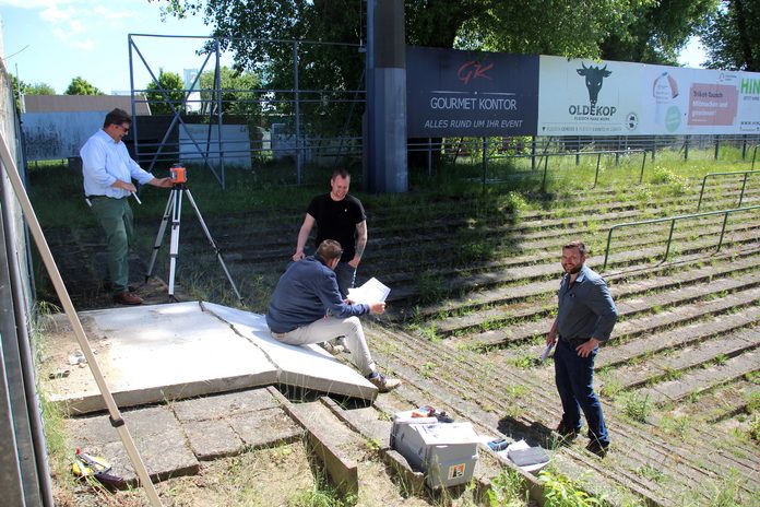 Die Planungen für den Umbau links von der Sparkassentribüne des VfB Lübeck werden gecheckt. Foto: sr