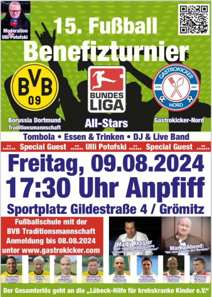 Man darf sich also auf eine Menge Fußballgeschichte in Grömitz freuen. Das Event kam in der Vergangenheit immer wieder sehr gut an, sodass die vergangenen Jahre immer die 1000er-Marke an Zuschauern geknackt wurde. Neben dem Fußballturnier, in dem ein Spiel zweimal 25 Minuten dauern wird, gibt es auch noch andere tolle Aktionen. Der Startschuss erfolgt um 16 Uhr mit dem Einlass der Zuschauer. Bereits dann ist es möglich die ersten Lose zu kaufen, wobei die Einnahmen an die „Lübeck-Hilfe für krebskranke Kinder e.V“ gespendet werden. Auch die anderen Stände werden geöffnet haben. Eine halbe Stunde später erfolgt das Aufwärmen der Spieler, bevor gegen 17 Uhr ein weiteres Highlight ansteht. Kommentator,- sowie Moderator Legende Uli Potofski wird das Event moderieren und darf sich mit Günter Kutowski über einen ersten Gesprächspartner freuen. Anschließend werden die Teams vorgestellt und ein gemeinsames Foto der drei Teams gemacht. Um 17.30 Uhr rollt dann erstmals der Ball. Die Gastrokicker empfangen, wie bereits im Vorjahr zum Auftakt die BVB-Allstars. Es folgen die Bundesliga-Allstars gegen den Gastgeber (18.40 Uhr), bevor das Turnier mit dem BVB gegen die Bundesliga-Auswahlmannschaft (19.50 Uhr) komplettiert wird. Zwischendrin warten auch Versteigerungen, sowie weitere tolle Aktionen für die Zuschauer. Es ist also nicht nur eine Veranstaltung für die Nostalgiker, die ihre früheren Idole wie Thomas Helmer, Iven Klasnic oder Bastian Reinhard nochmals in Aktion sehen wollen, sondern für jeden Mann. Gegen 20.30 Uhr endet planmäßig das Turnier und die Aftershowparty folgt. Dort wird Livemusik geboten von Marty Kessler, der seinen Grömitz-Song „Zwischen Sanddorn und Dünen“ performt. Auch auf „Die raue Stimme des Nordens“ aka Marko Abend darf sich gefreut werden.