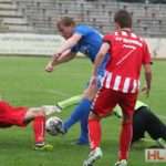 Foto: Christoph Kugel – SH-Liga: VfB Lübeck – TuS Hartenholm: Christopher Newe und Christian Jaacks (TuS Hartenholm) können das Tor zum 1:0 durch Stefan Richter (VfB Lübeck) nicht verhindern.