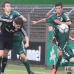 Foto: Christoph Kugel – Regionalliga Nord: VfB Lübeck U17 – JFV Nordwest U17: Nick Potlitz und Kubilay Büyükdemir (VfB Lübeck U17) im Kampf um den Ball mit Oliver Prondzinski (JFV Nordwest U17).