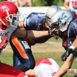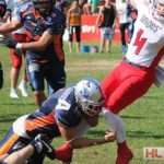 Foto: Caro Engel – GFL2: Rostock Griffins – Lübeck Cougars: Jamie Dale (Cougars) wird gestoppt.