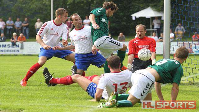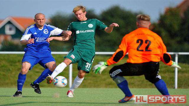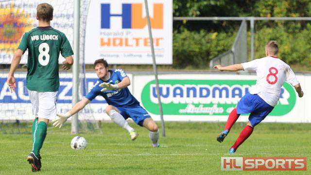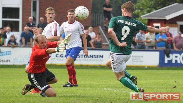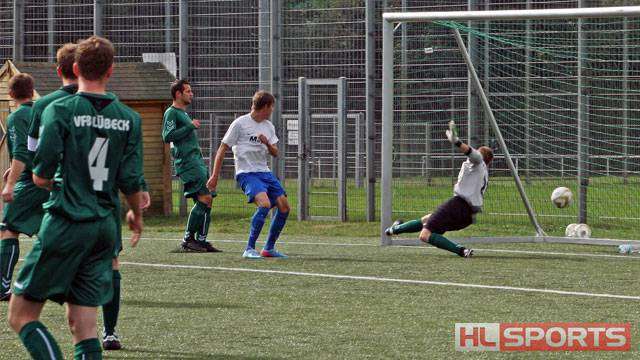 Foto: Matthias Banse – Kreisliga Lübeck: VfB Lübeck III – ATSV Stockelsdorf: Jannick Gerlach (ATSV) erzielt eines seiner fünf Treffer gegen Torhüter Mathy Groth (VfB).