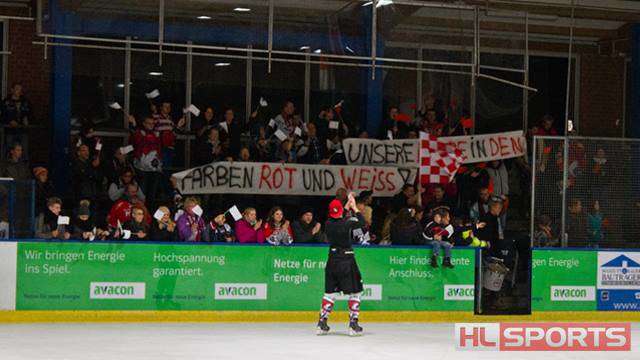 Oberliga Nord: Adendorfer EC – EHCT 06: Andre Gerartz (EHCT) feiert den Sieg mit den Fans.
