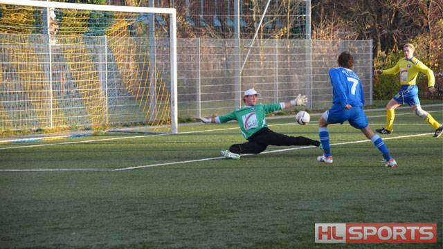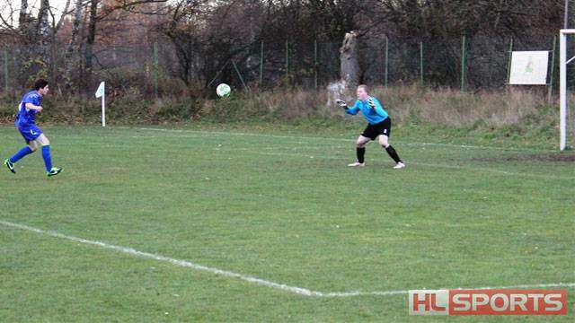 Foto: Jens Upahl – Altlüdersdorfs Keeper Bjarne Rogall kann nur noch hinterherschauen wie Kristof Rönnau das 1:0 für den FC Schönberg 95 erzielt