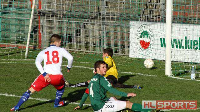 Foto: Matthias Banse – Arnold Höling (HSV) erzielt den 1:0 Siegtreffer gegen die U19-Auswahl des VfB Lübeck. Abwehrspieler Marcel Dümmel und Torhüter Alvaro Thomas Magel haben das Nachsehen