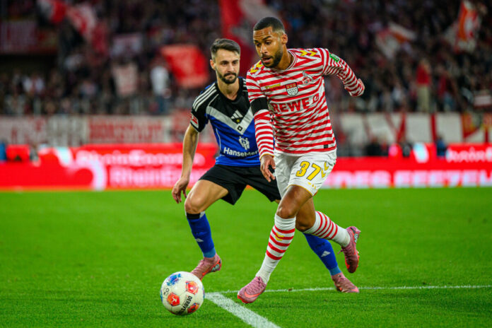 Ransford-Yeboah Königsdörffer (Hamburger SV) schießt an Eric Martel (1. FC Köln) vorbei. Foto: Lobeca/Henning Rohlfs