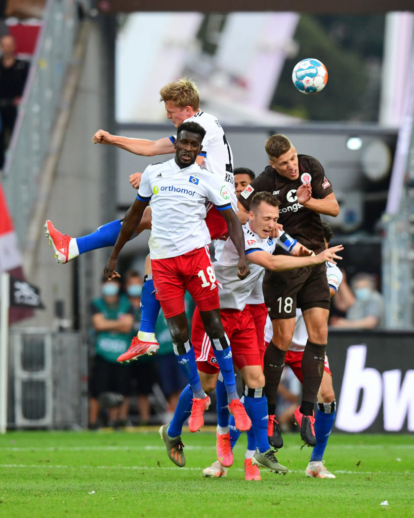 v.v. Bakery Jatta, Mikkel Kaufmann und Sebastian Schonlau (HSV) sowie Jakov Medic (St. Pauli) im Luftkampf. Foto: Lobeca/KBS-Picture Kalle Meincke