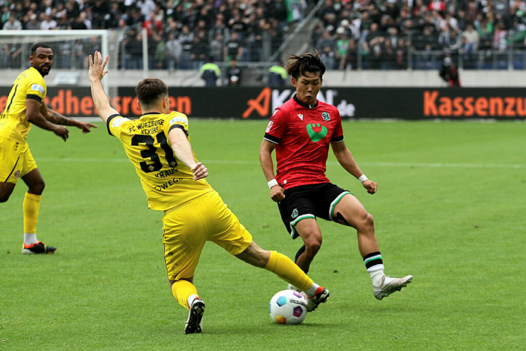 Tim Kraus (Würzburg) im Zweikampf mit Hayate Matsuuda (Hannover). Foto: Lobeca/Niklas Runne