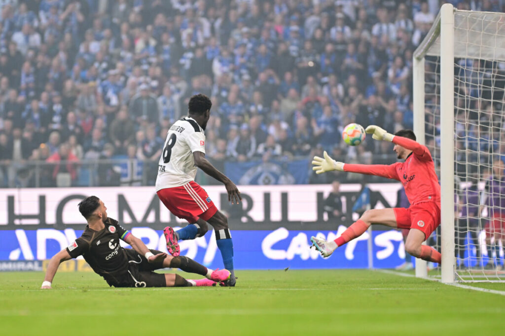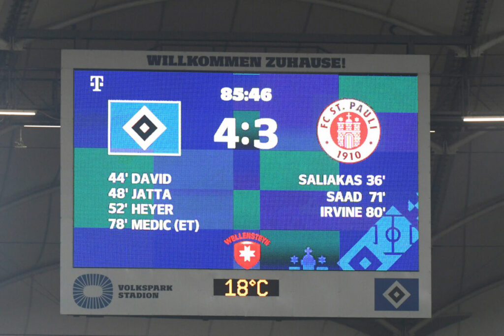 Sechs Minuten Verspätung gab es, denn erst vernebelte die Nordtribüne das Stadion in blau-weiß-schwarz. Als sich der Rauch verzog zündeten die Gäste-Anhänger Pyro. Den besseren Start in den zweiten Durchgang hatte der HSV. Schonlaus Flanke ging an Mets vorbei direkt zu Bakery Jatta (48.), der den Ball unter die Latte ins Netz zum 2:1 reinhämmerte. Dabei traf Paqarada den Flügelflitzer so schwer, dass der später ausgewechselt werden musste. Kalte Dusche für St. Pauli nur vier Minuten später. Moritz Heyer fiel ein Abpraller von Vasilj direkt vor die Füße, schoss aus sechs Metern zum 3:1 ein. Der Video-Schiri schaute noch einmal auf die Szene, denn Reis, der involviert war, soll im Abseits gestanden haben. Dem war nicht so und der Treffer zählte. Beim FC St. Pauli kam Saad (ehemals Eintracht Norderstedt) in die Partie und hatte direkt seine erste Vorlage auf Metcalfe (62.). Dessen Flachschuss ging knapp am linken Pfosten vorbei. Der Australier in Diensten am Millerntor leitete sechs Minuten später das nächste dicke Ding ein, doch Paqarada scheiterte an Heuer Fernandes. St. Pauli machte weiter und wurde belohnt. Elias Saad (71.) tauchte alleine vor dem Tor auf und versenkte den Ball im unteren linken Eck zum 2:3 aus Sicht der Gäste. Und wieder schaute der Video-Schiri darauf, hatte allerdings nichts zu bemängeln. Es war ein Spiel auf Messers Schneide, denn Smith (75.) verpasste den Ausgleich nur um Haaresbreite. Dann vielleicht der Genickbrecher für die Braun-Weißen: Jakov Medic (78.) rutschte in eine Flanke und bugsierte sich ins eigene Netz – 4:2 für den HSV. Verrückt: Nur zwei Minuten später klingelte es auf der anderen Seite. Jetzt trug sich Jackson Irvine mit dem 3:4-Anschlusstreffer in die Statistik ein. Der 1,89 Meter große Mittelfeldspieler köpfte eine Hartel-Ecke ins Netz. St. Pauli versuchte noch mal alles, doch das kampfbetonte, aber faire Spiel hinterließ Spuren bei beiden Mannschaften. Tore fielen nicht mehr und der Hamburger SV gewann ein tolles Fußballspiel nach 96 Minuten mit 4:3.