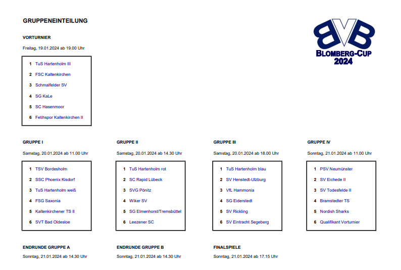 Am Freitagabend startet der Blomberg-Cup bei dem auf Vollbande gespielt wird um 19:30 Uhr mit dem Qualifikationsturnier. Der Sieger nimmt am Sonntag beim Qualiturnier für das Finale statt. Nach dem Freitagsturnier geht es um 22.00 Uhr mit einer After-Work-Party ins Wochenende. Am Samstag finden dann die Vorrundenturniere statt. Am Vormittag ab 11 Uhr treffen, der SSC Phoenix Kisdorf, TuS Hartenholm, SVT Oldesloe, FSG Saxonia, TSV Bordesholm und Kaltenkirchener TS II aufeinander. Das zweite Turnier beginnt ab 14.30 Uhr und das dritte startet ab 18 Uhr. Im Anschluss findet die Players-Night Gemeindehaus statt. Der Eintritt für beide Veranstaltungen ist natürlich frei. Am Sonntag steht dann das letzte Vorrundenturnier auf dem Programm. Dort spielen die Teams vom SV Eichede II, PSV Neumünster, SV Todesfelde, Bramstedter TS, Nordish Sharks und der Sieger des Freitagsturnier die zwei Finalteilnehmer aus. Für 18 Uhr ist dann das große Finale geplant.