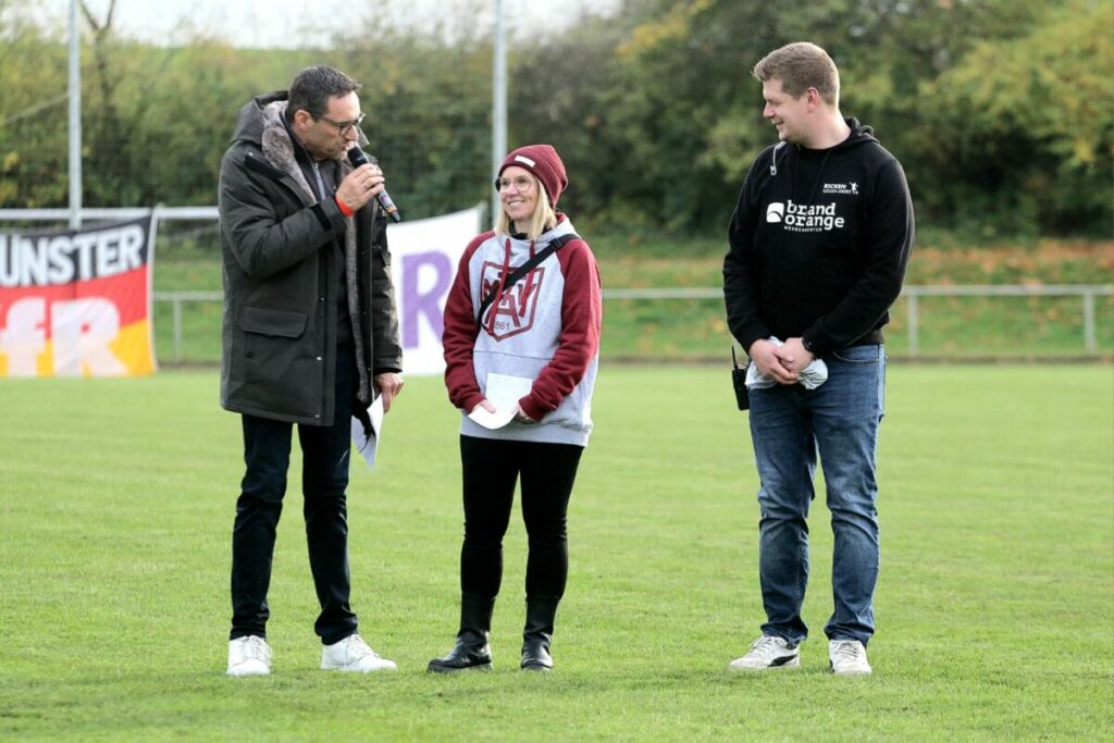 Bevor um 14.30 Uhr dann das Spiel der MTV-Auswahl gegen die Ex-Profis stattfand, sollte es hochemotional werden. Nina Tion, die Tante von Flynn, trat ans Mikrofon. Sie schaffte die Spendenaktion, die bereits über 40.000 € erreichte, ins Leben. Mit ihrer Rede sorgte sie bei den Anwesenden für Gänsehaut und Tränen in den Augen. „Das Leben zurzeit ist sehr dunkel, aber heute sehe ich hier viele kleine Lichter, die unseren schweren Weg begleiten. Die Tage fühlen sich so schwer an, aber heute spüre ich viele Arme, die uns ein Stück tragen“, sagte sie. Ihre Rede beendete die Tante des 13-Jährigen mit: „Manchmal treffen im Fußball kleine Gegner, vermeintlich chancenlos, auf die ganz Großen, und manchmal schaffen sie es, alle zu überraschen und zu gewinnen oder machen es dem Gegner schwerer als gedacht, weil sie die Hoffnung niemals aufgeben.“ Im Anschluss liefen die Mannschaften ein, doch bevor der Anpfiff ertönen sollte, folgte ein weiterer herzergreifender Moment. Flynn betrat gemeinsam mit seinem Vater und Trainer Krystian Kunde den Platz. Tobender Applaus hallte über den Grünen Redder. Ein Spendencheck in Höhe von 5.000 € wurde überreicht, bevor es anschließend ein großes Gruppenfoto gab.