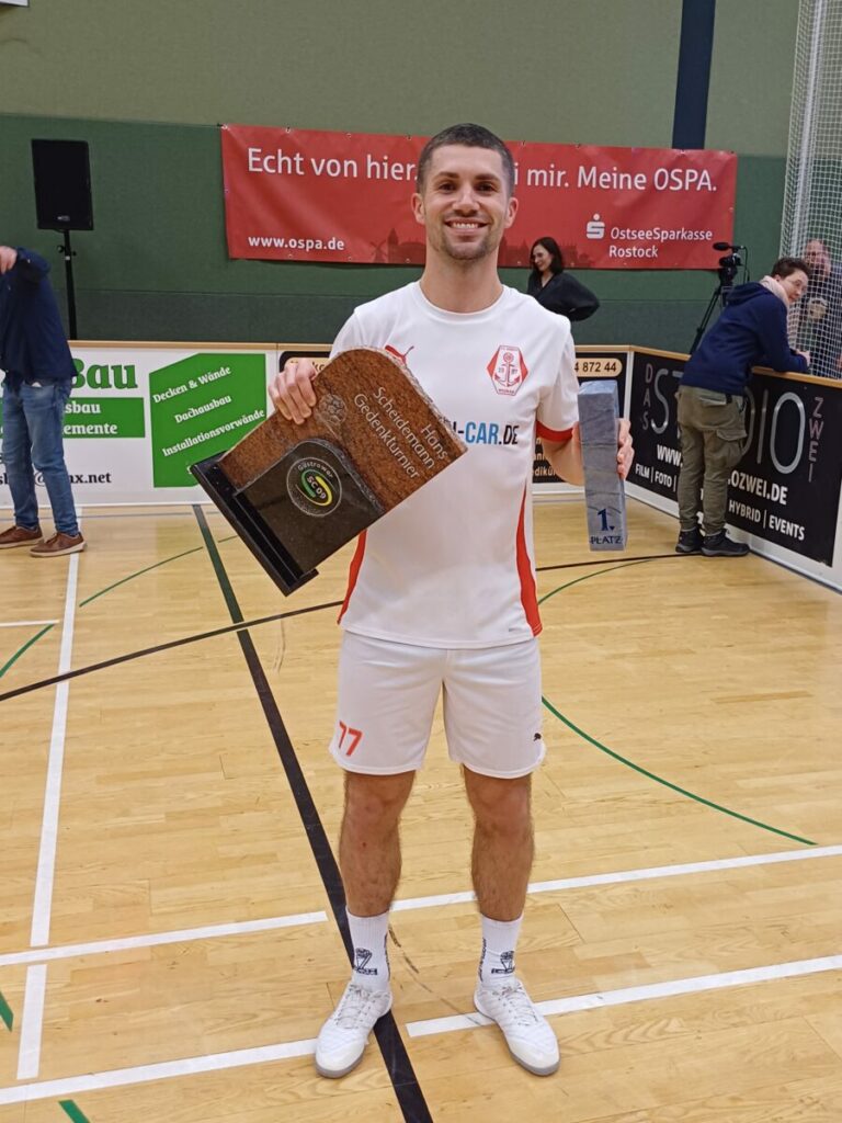 Für den FC Anker Wismar gab es Grund zu jubeln, denn nach 2011 konnte die Mannschaft zum zweiten Mal das Hans-Scheidemann Gedenkturnier gewinnen. Nach der 2:3-Niederlage gegen Barleben in der Vorrunde waren im Finale Lucas Meyer mit einem Hackentor nach Vorarbeit von Evgeni Pataman und Pataman selbst die Schützen zum 2:0-Endstand erfolgreich. Der entscheidende Treffer fiel 18 Sekunden vor dem Abpfiff. „Der Sieg ist etwas ganz Besonderes für das Team, das sonst nicht in der Halle trainiert. Einsatz und Willen waren ein Faustpfand bei den umkämpften Spielen, beim Remis gegen die U23 des FC Hansa stand Fortuna auf unserer Seite. Ein Sieg beim Jubiläumsturnier ist besonders schön“, so Wismars sportlicher Leiter Danny Pommerenke.