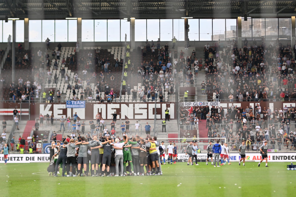 Die St. Paulianer machten von der ersten Sekunde nach dem Anpfiff deutlich, dass sie hier den Ton angeben wollten. Die Rothosen setzten zwar ebenfalls die Hürde hoch an, konnten aber das Tempo des Gegners nicht mitgehen. Burgstaller (21.) traf den Pfosten der Gäste. Die Kollegen Makienok (22.) und Medic (23.) hatten ebenfalls jeweils den ersten Treffer auf dem Fuß. Der war nur eine Frage der Zeit, denn in der 27. Minute traf Becker vom Fünfmeterraum zum 1:0 für die Gastgeber. Weitere Chancen hatten erneut Bugstaller (41.) und Neuzugang Hartel (42.). Der HSV jedoch spielte einmal schnell und kam damit durch. Kinsombi bediente Jatta, der quer auf Kittel (43.) frei vor dem Tor legte – drinnen. 1:1 zur Pause, bei der die Torschüsse klar mit 11:2 Richtung Kiezkicker ausschlugen.