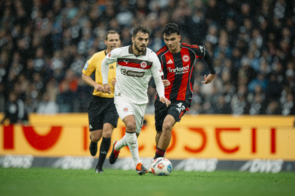 Beide Teams hatten nach schwachen Ergebnissen zuletzt umgebaut, St. Pauli-Coach Alexander Blessin stellte auf vier Positionen um und brachte unter anderem Hountondji in die Startelf. Die Gäste begannen vorsichtig und konzentriert, standen zunächst defensiv stabil, ohne selbst gefährlich zu werden. Frankfurt übernahm zwar früh die Kontrolle, doch auch die Hausherren taten sich im Spiel nach vorn schwer. In einer von Fehlpässen geprägten Anfangsphase blieb das Tempo niedrig, das Risiko gering. Erst ein individueller Fehler brachte die Wende: Vasilj konnte eine harmlose Flanke von Uzun nicht festhalten, Burkardt reagierte am schnellsten und köpfte zum 1:0 ein (36.). Danach verwaltete Frankfurt die Führung, St. Pauli fand kaum Wege nach vorn. Mit dem knappen Rückstand ging es in die Pause – sinnbildlich für eine zähe erste Hälfte.