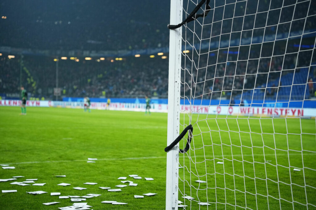 Flyer im Strafraum und Fahrradschlösser am Tor. Proteste der Hamburger Fans kurz vor der 2. Halbzeit. Foto: Lobeca/Daniel Haase