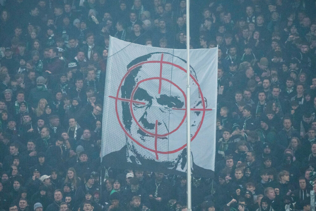 Banner im Fanblock von Hannover 96: Konterfei von Geschäftsführer Martin Kind mit einem Fadenkreuz. Foto: Lobeca/Daniel Haase