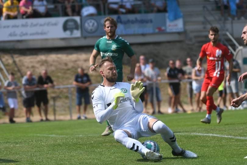 Das Halbfinale hatte es in sich, vor allem an Wärme, denn mit den 30 Grad im Schatten hatten die Kicker auf dem heißen Platz zu kämpfen. Die Gastgeber versteckten sich von Beginn an nicht und setzten den Drittligisten teilweise stark unter Druck. Der kam allerdings zur ersten Doppelchance durch Bahn (10.), die Szymura im 95-Gehäuse vereitelte. Vier Minuten später hatte Litka aus exakt der gleichen Position die Möglichkeit zur Gästeführung, doch erneut war Schönbergs Schlussmann da und hielt die null. In der nächsten Szene hätte er sich fast verschätzt, denn er versuchte Pulido (19.) im eigenen Strafraum auszuspielen. Das ging schief und der Rostocker Angreifer hatte den Führungstreffer vor Augen. Szymura machte seinen Fehler wieder gut, hechtete dem Schuss hinterher und erreichte ihn noch rechtzeitig. Glück für den Verbandsligisten. Der Druck von Hansa wurde größer und die Profis hatten nun alles im Griff.