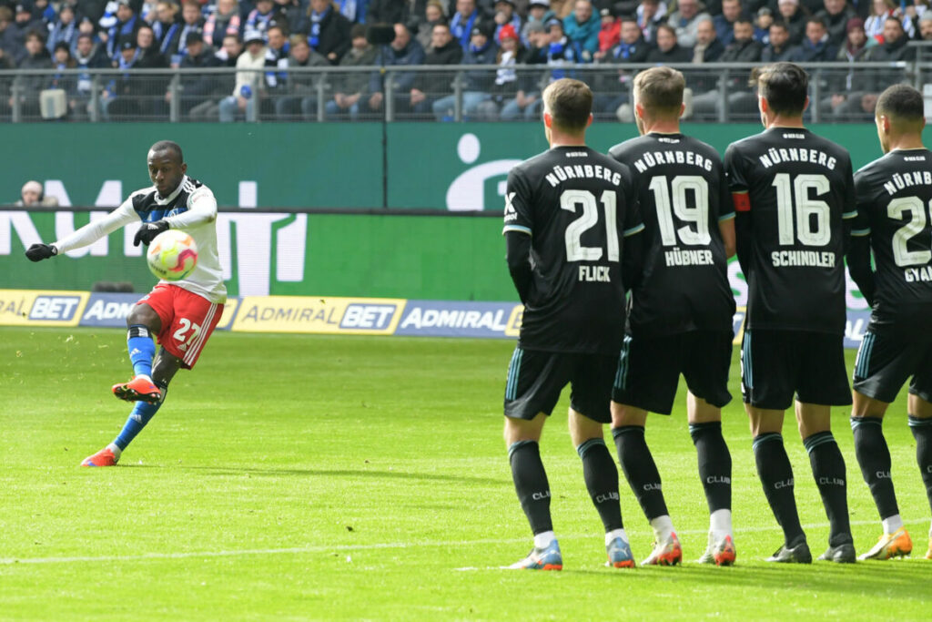 HSV-Trainer Tim Walter gab Winter-Neuzugang Noah Katterbach das Vertrauen für die rechte Abwehrseite. Ein Debüt für den 21-jährigen Leihspieler vom 1. FC Köln, der sich schnell zurechtfand. Das Gleiche galt übrigens für die Nürnberger, die sich in den ersten Minuten auf Augenhöhe präsentierten und mutig nach vorne spielten. Meist ging es für beide Mannschaften zwischen den Strafräumen hin und her, eine hundertprozentige Torchance gab es bis zur 18. Minute nicht. Da wurde Jean-Luc Dompe kurz vor dem FCN-Strafraum von Kapitän Schindler unsanft gestoppt. Der gefoulte Franzose schoss den Freistoß selbst und traf über die Mauer mit einem Zirkel zur Hamburger Führung. Der Kunstschütze lief danach zur eigenen Bank und schnappte sich ein vorbereitetes Trikot des angeblichen Dopings gesperrten Mario Vuskovic und zeigte es den Zuschauern. Danach ließen die Gäste nach und überließen mehr und mehr den Rothosen das Feld. Lediglich nach einer Ecke wurde es einmal gefährlich, als Castrop (34.) das Leder weit über den gegnerischen Kasten beförderte. Vier Minuten später parierte Hamburgs Torwart Heuer Fernandes einen Schuss aus spitzem Winkel von Duah. Kurz vor dem Seitenwechsel landete ein Freistoß aus dem Halbfeld am zweiten Pfosten bei Jatta. Der brachte die Kugel gefährlich zu Nürnbergs Tempelmann, von dem das Spielgerät auf das eigene Gehäuse ging. Torhüter Vindahl (44.) reagierte blitzschnell und verhinderte das zweite Tor der Hausherren.