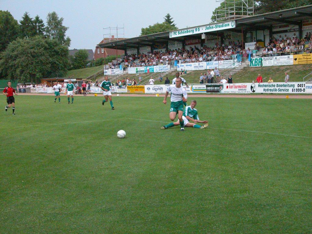 Am Dienstag, 3. Juni 2003 war es soweit. In Schönberg trafen die Reserve und die „Liga-Mannschaft“ aufeinander. Es war jedoch eher eine Begegnung, zwischen Schönberg II und einem Mix aus U19, zweite Herren und Altherren. Axel Giere (ehemaliger Trainer von Schönberg II) errinerte sich noch genau und sagte zu HL-SPORTS: „Es war so abgesprochen, dass die Leistungsträger aus der zweiten Herren in die „Erste“ gegeben und diese im Finale spielen werden. Weil die Jungs aus der ersten Herren ein paar Tage danach ein extrem wichtiges Relegationsspiel um den Aufstieg gegen Sachsen Leipzig hatten, saßen die meisten Akteure aus der Liga-Truppe am besagten Tag nur auf der Tribüne. Ich habe mir dann eine Mannschaft aus der A-Jugend, zweiten Herren und Altherren zusammengestellt.“ Die Favoritenrolle lag also immer noch klar bei Schönberg I. Diese gingen auch zunächst durch Pocisk in Führung. In der 45. und 46. Minute gab es dann den Doppelschlag der „Zweiten“. Stutzky und Meier trafen und feierten mit ihrem Team den Pokalsieg. Obwohl es ein internes Vereinsduell war, ging es heiß her. „In den letzten Minuten hat sogar Stutzky noch gegrätscht. Das war überhaupt nicht sein Spielstil, aber es war bezeichnend. In der Partie war Feuer drin“, so Giere. Jens Upahl (Urgestein des FC Schönberg und heute immer noch Pressewart): Es war nicht viel Euphorie zu spüren. Es waren an dem Tag auch nur knapp über 400 Zuschauer im Jahnstadion. Danach gab es ja auch noch einige Probleme.“