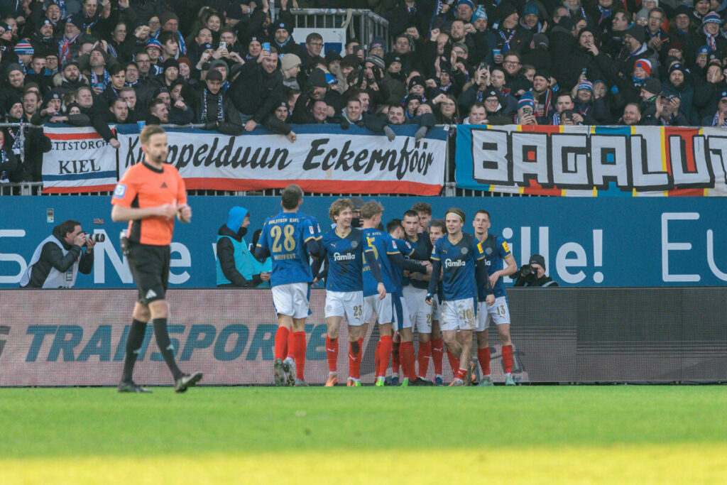Spieler von Holstein Kiel jubeln über das zweite Tor. Foto: Lobeca/Jasper Lorenz