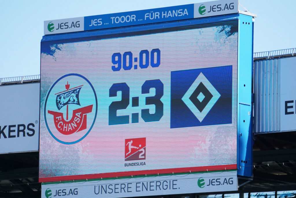 Die Gäste hatten zu Beginn ihre Probleme mit der forschen Art der Hausherren. Fröde (2.) traf nach Flanke von Malone per Kopfball die Latte. Auf der anderen Seite versuchte es Vuskovic (10.) nach Flanke von Heyer ebenfalls per Kopf, doch die Kugel ging knapp am linken Pfosten vorbei. Drei Minuten später die Hansa-Führung. Sikan enteilte Hamburgs Kapitän Schonlau und brachte das Leder irgendwie an HSV-Schlussmann Heuer Fernandes vor das Tor, wo Nico Neidhart (13.) zum 1:0 einschob. Muheim (15.) hatte die schnelle Antwort auf dem Fuß, doch sein Schuss flog am Kasten vorbei. Danach machte nur noch die „Kogge“ Dampf. Ingelsson (19.) und Roßbach (20.) scheiterten an Heuer Fernandes, Verhoek und Rizzuto (23.) verpassten beide nach einer Bahn-Flanke. Und auch Sikan (33.) traf nicht zum 2:0, stattdessen ging sein Schuss aus Nahdistanz einen Meter vorbei. Kurz vor der Pause rettete Kolke (43.) die Führung gegen einen Schonlau-Kopfball in die Kabine, denn auch nach der folgenden HSV-Ecke blieb ein Vuskovic-Schuss in der Abwehr hängen.