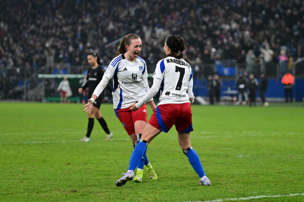 Doppelchance zu Beginn der zweiten Hälfte für die Rothosen. Meyer (47.) traf nur die Latte nach Flanke von Kardesler, doch die hatte selbst danach noch eine weitere große Möglichkeit, verfehlte allerdings aus Nahdistanz nur knapp. In der 68. Minute war der Sack dann zu. Mit dem 2:0 durch Vildan Kardesler war der Halbfinaleinzug sonnenklar im frostigen Volkspark. Baum setzte sich gegen drei Gegenspielerinnen durch und bediente in der Mitte Kardesler, die noch Corres austeigen ließ und die Kugel über die Linie schob. Den nächsten Treffer hatte Schulz (76.) auf dem Kopf, doch nach Einzelvorbereitung von Woelki gegen drei Fohlen, köpfte Schulz das Leder knapp am rechten Pfosten vorbei. Noch einmal Woelki (78.), wieder gegen zwei, doch bei Nummer drei war dann Schluss. Baum (82.) hatte auch noch eine Chance, denn mit ihrem direkten Freistoß aus spitzem Winkel musste Frehse schnell parieren. Für die Gäste kam der erste Torschuss eine Minute später, doch Aslanaj blieb volley am Gegner hängen. Zwei elfmeterreife Szenen gab es im Mönchengladbacher Strafraum auch noch, doch beide Male verwehrte Schiedsrichterin Miriam Schwermer dem HSV einen Strafstoß. Die Gastgeberinnen spielten es locker runter und freuten sich nach dem Abpfiff mit ihren Fans über das Halbfinale.