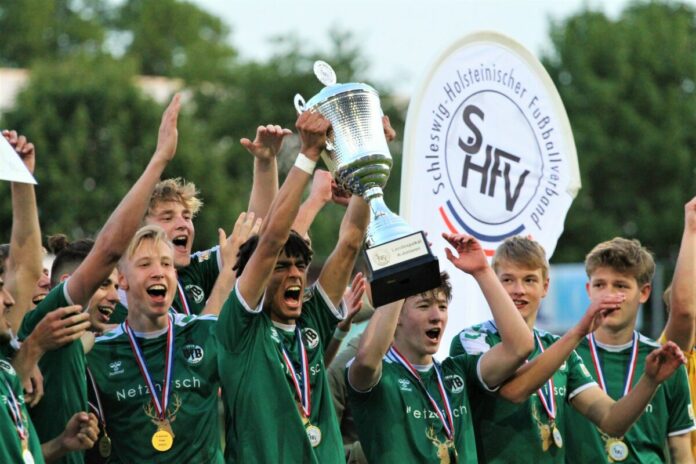 Lübeck – Das war so ganz nach dem Geschmack des VfB Lübeck! Am Donnerstagabend trafen im Stadion an der Lohmühle die U19 des VfB Lübeck und die U19 von Holstein Kiel im Endspiel um den SHFV-Pokal der A-Junioren aufeinander. Den Pokal sicherten sich dabei die als Underdog angetretenen Hausherren, die vor der tollen Kulisse von 1086 Zuschauer an der Lohmühle völlig verdient mit 2:1 die Oberhand behielten. Dementsprechend ausgelassen ging es dann auch nach dem Abpfiff und einige Zeit danach bei den Feierlichkeiten zu. HL-SPORTS hatte trotzdem die Chance U19-Trainer Jerome Arps nicht nur zum gelungenen Auftritt seiner Jungs zu gratulieren, sondern ihm auch ein Statement zu entlocken.