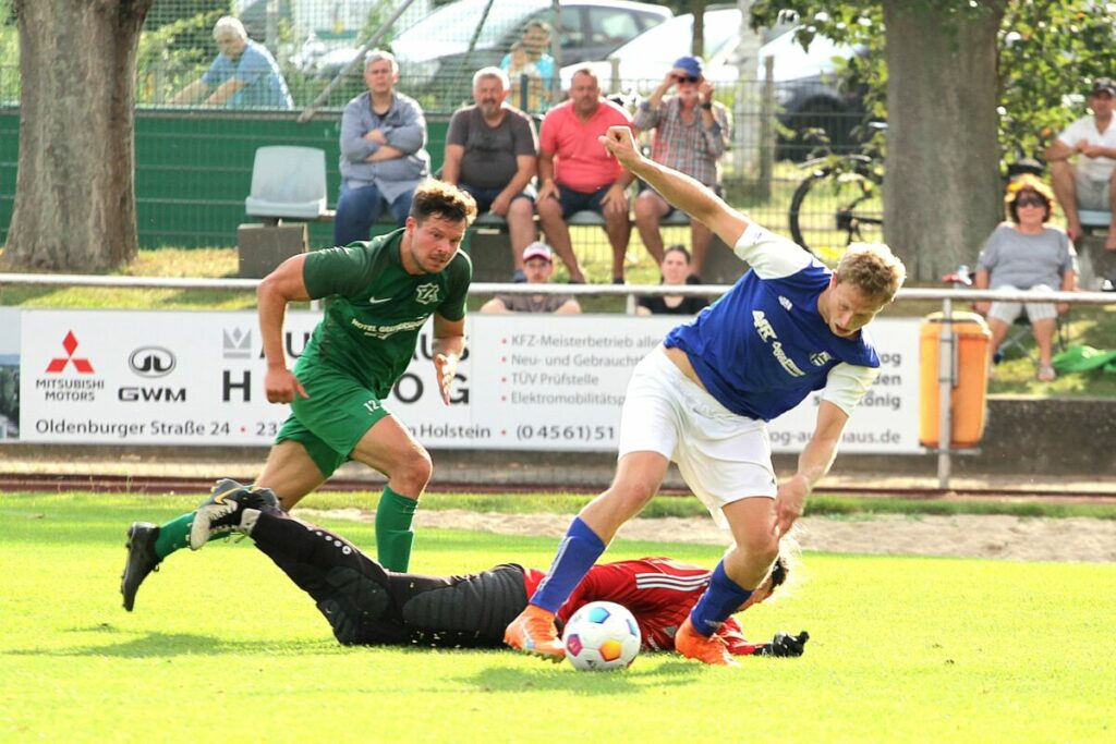 Das Topspiel des sechsten Spieltags bekam man im Dersauer Waldstadion zu sehen. Der heimische ASV Dersau empfing die SG Doberstorf/P’hagen, oder um es in Tabellensprache zu sagen: Der Tabellenzweite, den Dritten. Die Partie versprach also ein hohes Niveau. Die Gäste aus Doberstorf, zeigten sich in den ersten Spielen vor allem in der Offensive enorm stark. 17-mal jubelte die SG in den ersten vier Partien. Man fegte über Eutin II (4:1) und die FT Preetz (6:0) hinweg und spielte sich in den Kreis der Titelfavoriten. Dabei bietet man vor allem einfachen Fußball. Es sind die Basics, die bei ihnen funktionieren. Die Mannschaft bringt vor allem eines mit: Erfahrung. Gleich mehrere Spieler liefen bereits in höheren Ligen auf. Sei es ein Timo Federwisch (Landesliga mit dem TSV Stein) oder aber Kjell Gonda (135 Oberliga-Spiele). Zwar haben sie das beste Fußballalter, bereits überschritten, die Grundtugenden allerdings selbstverständlich nicht verloren. Der gute Saisonstart kommt also nicht von ungefähr, allerdings wurde man zuletzt auf den Boden der Realität zurückgeholt. Man erwischte einen der berühmten Tage, an denen es einfach nicht sein sollte. Gegen die SpVgg Putlos verzweifelte man an einem starken Keeper und bekam hinten ein Traumtor zur 0:1-Pleite. Es war nach dem 4:5 gegen Klausdorf II am ersten Spieltag, die zweite Niederlage. Nun wartete mit dem ASV Dersau einer der Top-Favoriten auf den Titel. Dies untermauerten sie mit vier Siegen aus den ersten fünf Spielen. Die Hintermannschaft ist relativ stabil und vorne ist man immer für ein Tor gut. Gegen Lensahn in der Vorwoche waren es in der Schlussphase gleich vier. Dreimal konterte man erfolgreich. Mit drei Treffern nach Einwechslung war es vor allem Philip Popall der einen großen Anteil am Sieg hatte. Gegen die SG Doberstorf/P’hagen saß er allerdings erneut erst einmal nur auf der Bank. Stattdessen startete vorne mit Steffen Uhl ein erfahrener Mittelstürmer, der in den ersten drei Wochen noch fehlte. Gegen die SpVgg Putlos gab er sein Saisondebüt und krönte dieses mit einem Tor. Am Sonnabend dauerte es keine 180 Sekunden, da jubelte Uhl (3.) erneut. Er brachte die „Keiler“ früh in Führung. Anschließend dauerte es etwa eine halbe Stunde bis zum nächsten Tor. Timo Federwisch (35.) glich aus. Es war ein enges, spannendes Spiel, dass nun komplett gedreht werden sollte. Kjell Gonda (45.) brachte die Gäste mit Pausenpfiff in Führung. Das erwähnte, erfahrene Duo stach wieder zu und schockte den ASV. Im zweiten Durchgang passierte erst einmal relativ wenig, doch dann zeigte der Schiedsrichter auf den Punkt. Dersau bekam die Möglichkeit auf den Ausgleich. Uhl (69.) trat an und schnürte den Doppelpack. Es deutete sich ein Remis an, doch es ging in die Schlussminuten. Die Gastgeber wurden dezimiert (88.) und versuchten mit zehn Mann das 2:2 über die Zeit zu bringen. Doberstorf allerdings erzielte bereits acht Treffer in der letzten halben Stunde und der neunte sollte folgen. Kjell Gonda (90.) gelang der Lucky-Punch zum 3:2-Auswärtssieg. Es war die zweite Saisonniederlage für Dersau. Doberstorf dagegen überholte den Gegner in der Tabelle und sprang auf den zweiten Platz.