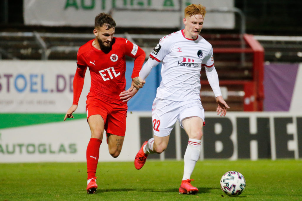 Fabian Holthaus (FC Viktoria Köln) und Pascal Steinwender (VfB Lübeck). Foto: amafuma.de/Heiko van der Velden