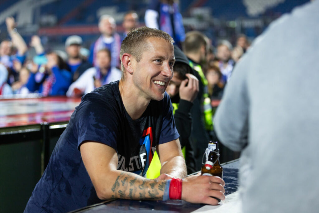Die Pressekonferenz nach dem Spiel lief kurz ab. Nur Kiels Coach Marcel Rapp war da und sagte: „Unbeschreibliche Gefühle. Es war ein starker Gegner und die Jungs haben wieder alles auf dem Platz gelassen. Wir machen in der ersten Halbezeit direkt ein Tor, verteidigen gut und finden mit dem Ball gute Lösungen. Mit der großen Chance zum 2:0 hätten wir den Sack zumachen können. In der zweiten Halbzeit bekommen wir den Ausgleich und dann haben wir wie so oft alles reingeworfen. Die Jungs haben alles auf dem Platz gelassen.“ Danach stürmte die Mannschaft den kleinen Presseraum und sorgte bei ihrem Coach und Pressesprecher Peer Wellendorf für eine Bierdusche. Völlig durchnässt setzte sich Rapp noch einmal ans Mikrofon und fuhr mit seinem Statement fort: „Es ist einfach herausragend, heute wieder Timo Becker fällt kurzfristig aus und Lasse Rosenboom spielt, macht ein herausragendes Spiel, weil die Trainingsleistung immer richtig gut ist. Die Jungs wissen was zu tun ist. Dann kommen sie rein und performen einfach und das hat uns die ganze Saison getragen. Der Zusammenhalt ist unbeschreiblich.“