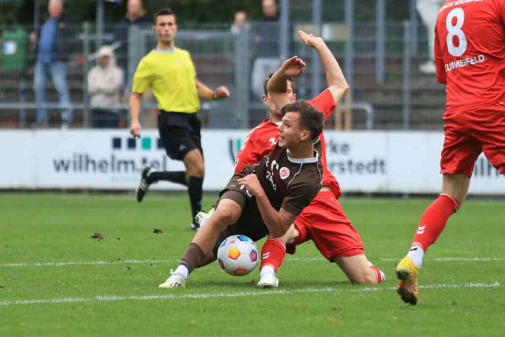Gute Chancen hatten beide Teams in der Anfangsphase, Norderstedt ein Plus in der Statistik, doch die Braun-Weißen trafen zuerst. Marie (28.) traf von der Strafraumgrenze in den Winkel zur St. Pauli-Führung. Die Gäste legten acht Minuten später durch Ulbricht mit dem 2:0 nach. Da sah vor allem Eintracht-Torwart Exner nicht gut aus, denn der irrte dabei etwas durch den eigenen Strafraum. Kurz danach hatten Zehir und Kummerfeld die Doppelchance zum Anschluss, doch das Hamburger Tor schien vernagelt. Erst Nick Gutmann (44.) überwand Ahlers im gegnerischen Kasten, erzielte den 1:2. Frahm hätte sogar noch vor de Pausentee auf Unentschieden stellen können, doch Ahlers hatte die Finger noch dazwischen.