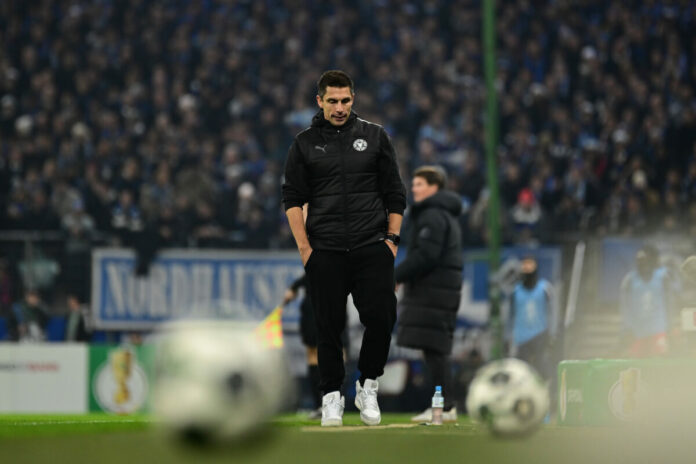 Marcel Rapp (Cheftrainer, Holstein Kiel) blickt nach unten. Foto: Lobeca/Felix Schlikis
