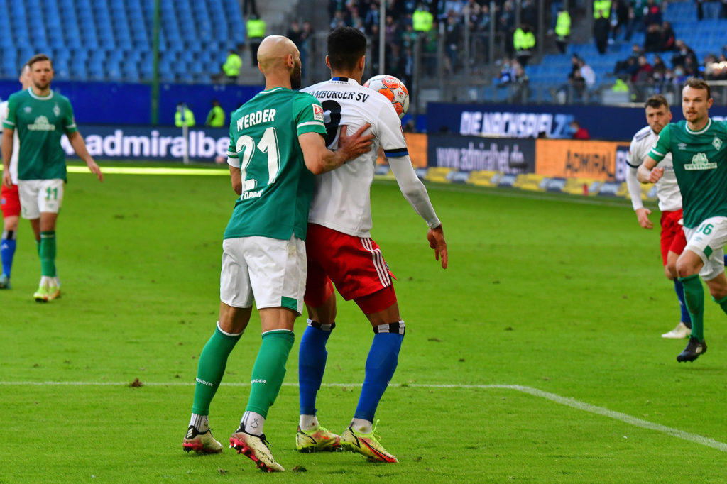 Die Gäste begannen zielstrebig und setzten die Hamburger früh unter Druck. Die Bremer Führung war die erste strittige Szene der Partie. Eine Werder-Ecke landete zum Nachschuss bei Toprak (7.). Dessen „Schuss-Flanke“ landete bei Bittencourt die Kugel per Kopf ins Tor beförderte. Der stand allerdings im klaren Abseits und der Treffer zählte nicht. Dennoch checkte der „Kölner Keller“, denn bei Topraks Ballabgabe soll Hamburgs Meffert das Spielgerät absichtlich mit der Hand berührt haben. Schiedsrichter Daniel Siebert aus Berlin sah sich das Ganze noch einmal an und entschied auf Elfmeter für den SVW. Marvin Ducksch (9.) verwandelte locker zum 1:0. Bremen blieb gefährlich, doch die Rothosen beförderten die Kugel in der 18. Minute ebenfalls ins Netz. Muheim flankte und Heyer traf im Nachschuss zum vermeintlichen Ausgleich. Dieses Tor zählte nicht, weil Glatzel mit einem harten Einsatz Bremens Kapitän Toprak zuvor im Fünfmeterraum zu Fall brachte. Auf der anderen Seite ließ Alidou Gegenspieler Weiser (22.) im 16er auflaufen, doch dieses Mal ließ Siebert weiterspielen. Das Team von der Weser hatte alles im Griff, ließ zwei Großchancen liegen: Bittencourt (30.) und Ducksch (33.) scheiterten jeweils an HSV-Schlussmann Heuer Fernandes (zwei Weltklasse-Paraden!). Eine Minute vor dem Pausentee hatten die Hausherren ihre erste richtige Möglichkeit, doch Glatzel brachte das Leder nach einer Jatta-Hereingabe nicht an SVW-Torwart Pavlenka vorbei.