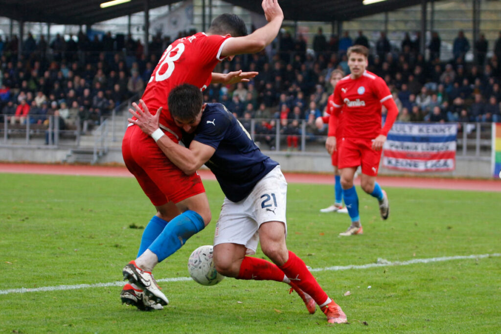 Valdemar Sadrifar (1. FC Phönix Lübeck) versucht Stefan Rankic (Holstein Kiel II) weg zu schieben. Foto: Lobeca/Andreas Knothe