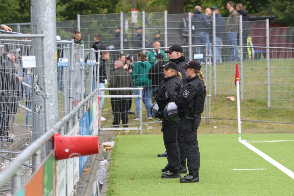 Das war Marvin Thiel, der mit seiner Mannschaft sich nach dem Abpfiff über kleine Umwege (die Polizei war aufmarschiert vor dem Gästeblock/Foto) zunächst beim eigenen Anhang bedankte, danach Rede und Antwort stand. So sagte der Kapitän zunächst mit Blick auf die Treffer der Außenbahnspieler. „Joel hat in der ersten Halbzeit echt ein schönes Tor gemacht. Ich dann in der zweiten Hälfte auch. Wir haben gewonnen, dass war ja auch unser Ziel. Im Endeffekt war es ein unangenehmes Spiel. Kiel hat einen guten Ball gespielt, versucht hohe Ballgewinne zu erzielen. Das haben sie aber selten gut ausgespielt“, so Thiel, der weiter anfügt: „Wir machen viel richtig, gehen 2:0 in Führung, bekommen dann aber leider das 2:1. Dann wird es danach noch ein bisschen hektisch. Am Ende haben wir aber die Aufgabe gemeistert, sind in die nächste Pokalrunde eingezogen. Das ist das, was zählt.“ Dort geht es für den VfB nun gegen den SC Weiche Flensburg 08 (8. Oktober?) weiter…