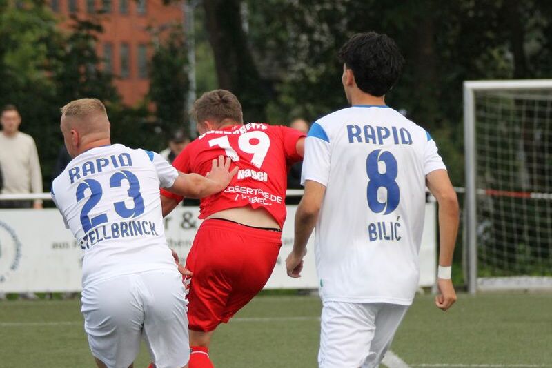 Lübeck – Der SC Rapid Lübeck darf sich erstmals in dieser Landesliga-Saison Derbysieger nennen. Nach einer umkämpften ersten Halbzeit, in der der FC Dornbreite durchaus verdient 1:0 führte, kamen die Jungs vom Kasernenbrink nach der Pause furios zurück. Über 350 Zuschauer sahen fünf Tore des SCR, der nach zwei Spieltagen nun elf Treffer erzielte. Bis zur 85. Minute blieb es eng, denn obwohl Rapid die Kontrolle übernahm, führten sie nur mit einem Tor – bis dato. Peywend Cabbar machte mit seinem zweiten Tor – zuvor erzielte er den Ausgleich – den Deckel drauf. Zudem durften Mario Nagel und Tino Arp noch einmal jubeln.