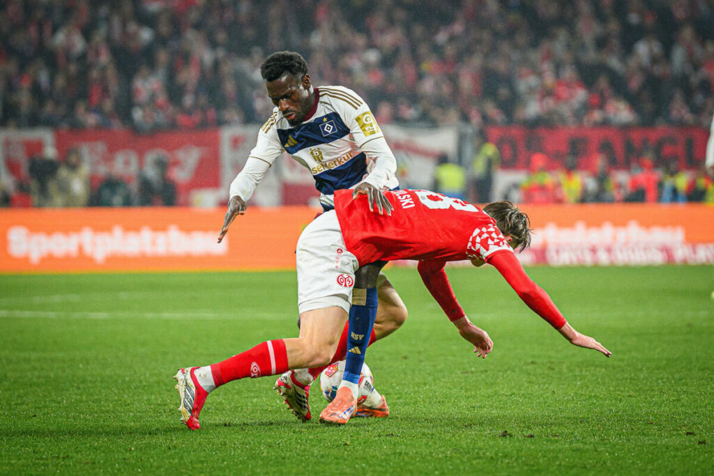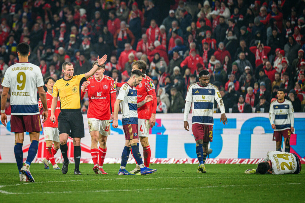 In einer zunächst unterhaltsamen Partie entwickelte sich früh Tempo auf beiden Seiten. Fabio Vieira (4.) prüfte Batz aus der Distanz, später hatte Glatzel nach starker Vorarbeit von Otele (26.) die große Chance zur Führung, scheiterte aber aus acht Metern am Mainzer Keeper. Auch Omari (21.) und Königsdörffer im Nachsetzen ließen gute Möglichkeiten liegen. Mainz blieb vor allem über die linke Seite gefährlich. Silas sorgte immer wieder für Unruhe, bewegte sich allerdings nach einer frühen Verwarnung auf dünnem Eis. Nach mehreren hitzigen Szenen – inklusive Gelber Karten für Muheim sowie beide Trainerbänke – wurde die Partie zunehmend zerfahren. Dann nutzten die Rheinhessen ihre erste echte Chance eiskalt: Da Costa flankte von rechts halbhoch vor das Tor, Nadiem Amiri (42.) traf am ersten Pfosten aus acht Metern technisch stark per Direktabnahme ins lange Eck zum 1:0. In der Schlussphase blieb es intensiv, Kohr sah noch Gelb, ehe Schiedsrichter Braun zur Pause pfiff. Mainz führte glücklich, der HSV hatte insgesamt mehr vom Spiel.