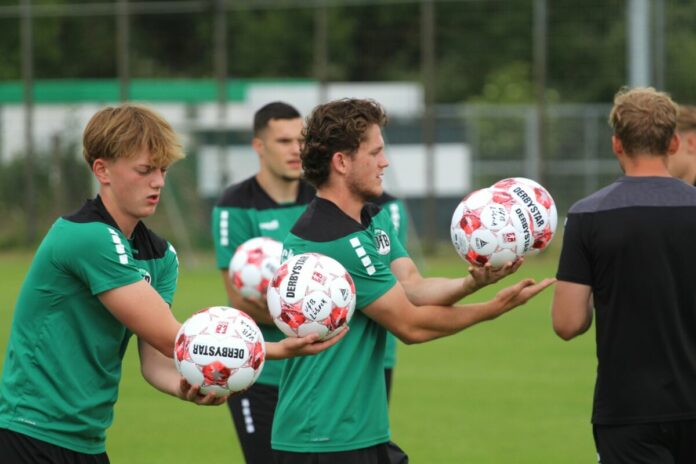 Insgesamt 80 Minuten dauerte das Training am Vormittag. Nach dem obligatorischen Warmlaufen, gefolgt vom gemeinsamen Singen für Geburtstagskind Luca Menke, stand dabei ganz weit vorne eine Challenge, oder von Guerino Capretti bezeichnetes Fußball-Biathlon. „Wir wollten was für die Ausdauer machen, die Spieler sollen aber langsam reinkommen“, begründet der Cheftrainer der Grün-Weißen. Am Nachmittag stand dann noch ein Turnier (Viererteams) auf dem Programm.
