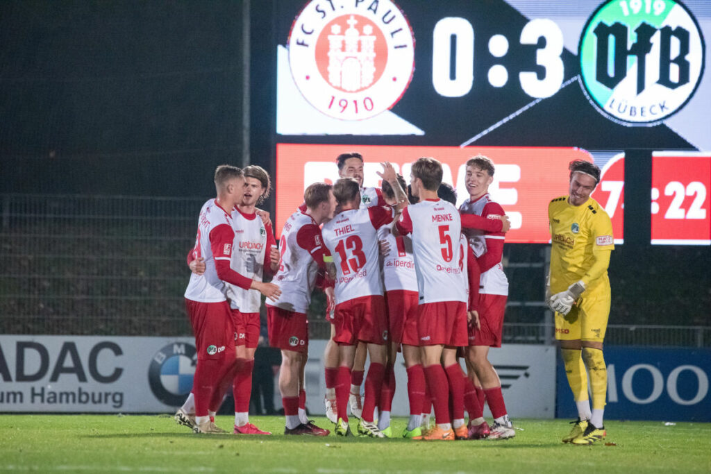 Lübeck – Der VfB Lübeck hat am Dienstagabend in der Regionalliga Nord vor 718 Zuschauer, davon viel Support aus dem eigenen Anhang, in Norderstedt mit 3:1 (1:0) gegen FC St. Pauli II gewonnen. Manuel Farrona Pulido (20.), Herdi Bukusu (73.) und Felix Drinkuth (77.) erzielten die drei Treffer für die Grün-Weißen. Mit einer starken defensiven und offensiven Leistung, mit viel Druck gegen den Ball und mit einer gewissen Konsequenz vor dem gegnerischen Tor überzeugte die Mannschaft von Guerino Capretti. Das schönste Tor lieferte der eingewechselte Drinkuth, der einen Freistoß aus knapp 30 Metern direkt in den Winkel verwandelte. Durch den Erfolg gegen St. Pauli befindet sich der VfB Lübeck bis zum kommenden Auswärtsspiel gegen Werder Bremen II auf dem 9. Platz.