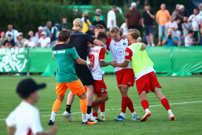 Neumünster – Der VfB Lübeck gewinnt nach Elfmeterschießen im Halbfinale des Landespokals gegen den PSV Neumünster. In der regulären Spielzeit trennten sich die Teams 0:0-Unentschieden. Der VfB Lübeck kam bis zu Pause nur selten vor das gegnerische Tor. Zudem verschoss Kapitän Marvin Thiel in der 33. Minute einen Elfmeter, der Nachschuss von Jorik Wulff landete zwar im Netz, allerdings aus Abseitsposition. Im zweiten Durchgang kamen die Grün-Weißen etwas besser in die Begegnung, jedoch war Neumünster immer mal wieder gefährlich. Schlussmann Torben Franzenburg parierte mehrere Male bärenstark. Im Elfmeterschießen war es dann eine Zitterpartie. Mika Lehnfeld verwandelte den entscheidenden 14. Elfmeter, um den Finaleinzug klarzumachen.