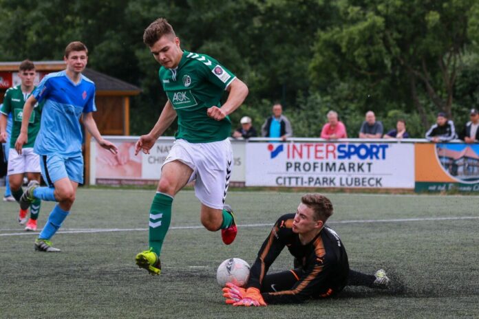 Dennis Tiessen spielte in der Saison 2017/2018 schon für die A-Jugend des VfB Lübeck U19). Hier im Zweikampf mit gegen Torwwart Roy Schleinecke (Blumenthaler SV). Foto: Lobeca/Michael Raasch