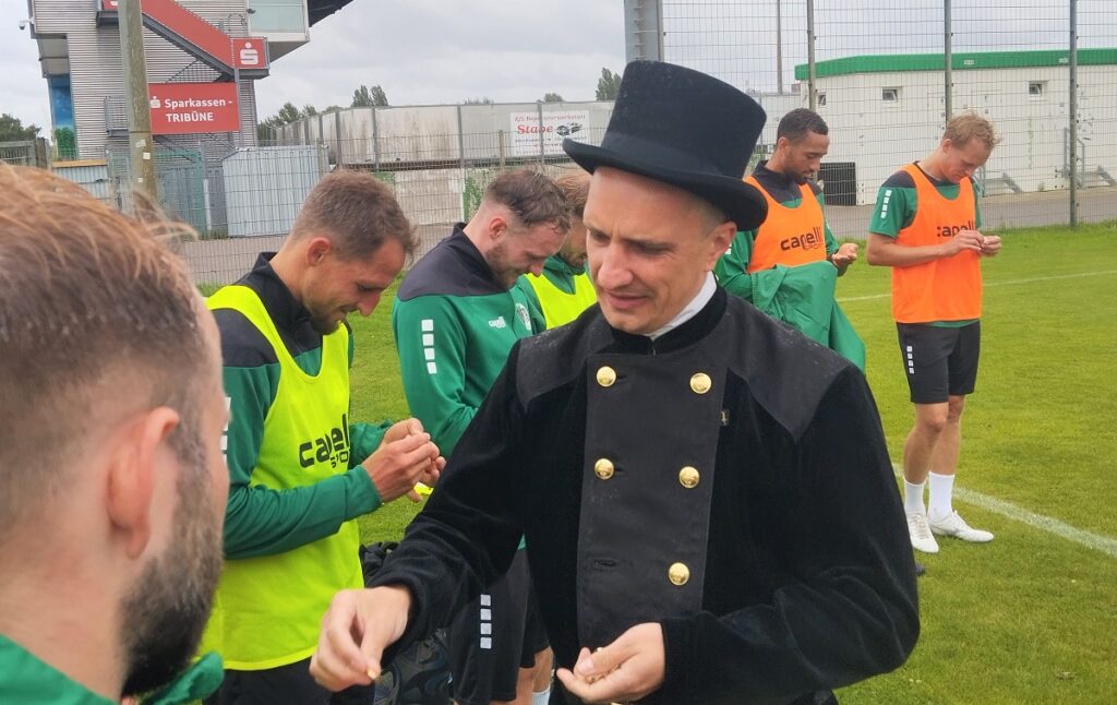 Lübeck – Es kann eigentlich losgehen beim VfB Lübeck. Nachdem das Team von Coach Lukas Pfeiffer am Mittwoch zwei Trainingseinheiten absolviert hat, geht es heute Nachmittag (15.30 Uhr) noch auf den Platz, ehe der Drittligist am Freitag (11 Uhr) sein Abschlusstraining abhält. Das alles natürlich mit Blick auf das Match am Sonnabend (14 Uhr) in der 3. Liga gegen den SV Sandhausen, einem der Topfavoriten in der Spielklasse, der möglichst sofort wieder hoch möchte in die 2. Liga nach dem Abstieg im Sommer. Doch auch die Grün-Weißen haben ihre Ziele – an vorderster Stelle sei da der Klassenerhalt vermerkt. Dass man mit dem (wohl) kleinsten Etat der Liga eher der Underdog ist, sollte aber auch nicht vergessen werden. Die Schleswig-Holsteiner müssen über das Team kommen, ihre Stärke aus der Vorsaison wieder ins Rennen werfen. Doch auch Glück wird natürlich benötigt, das gestern nach der Nachmittagseinheit übrigens auf der Lohmühle vorbeischaute. Das in Form eines Schornsteinfeger, den Sebastian Schultz aus Nusse, der der Mannschaft persönlich viel Glück wünschte und jedem auch noch gleich einen „Glückstaler“ überreichte.