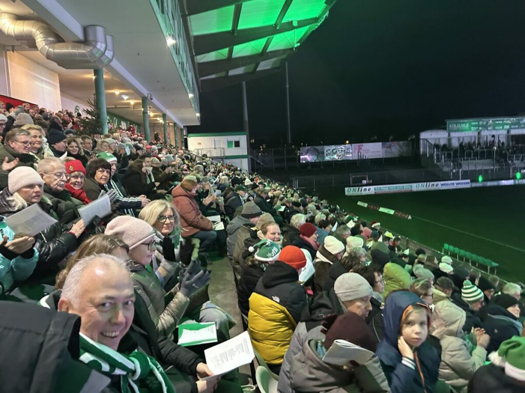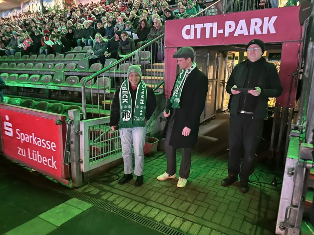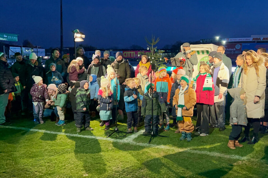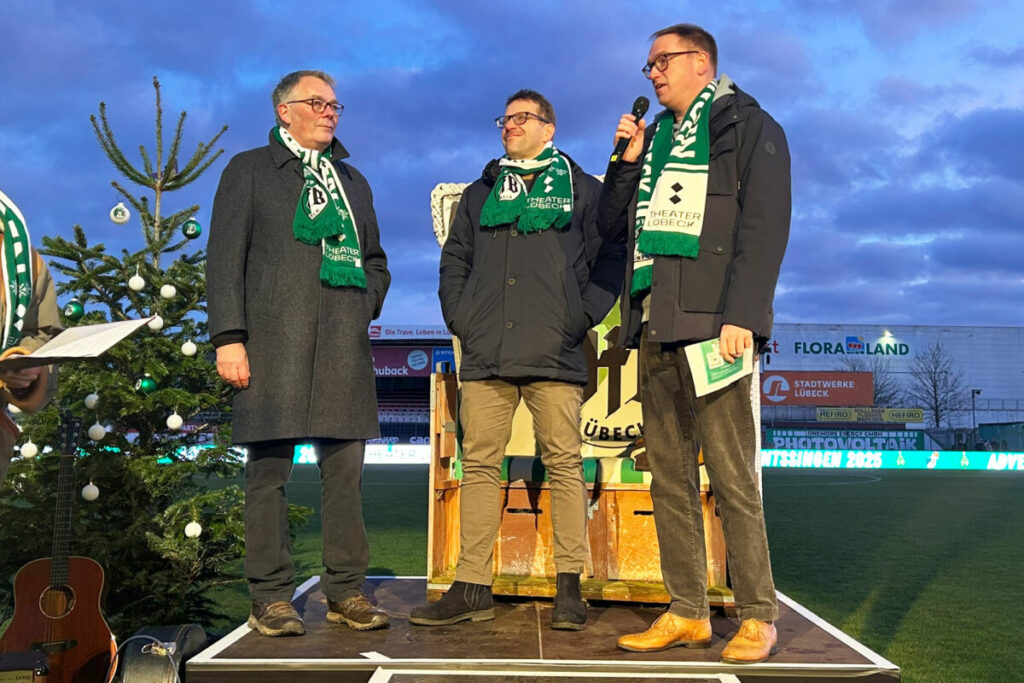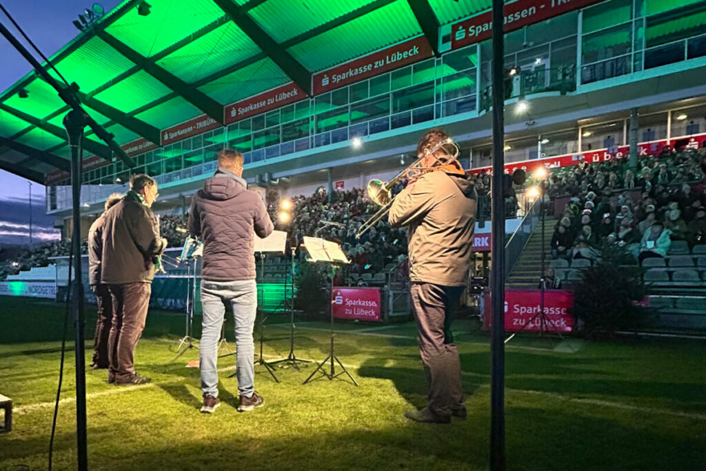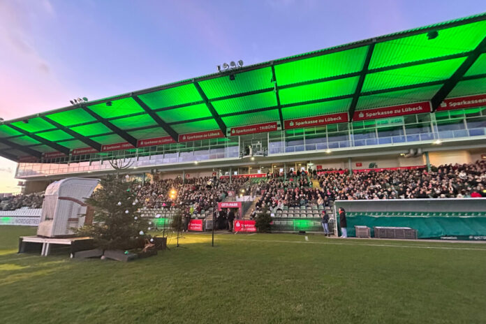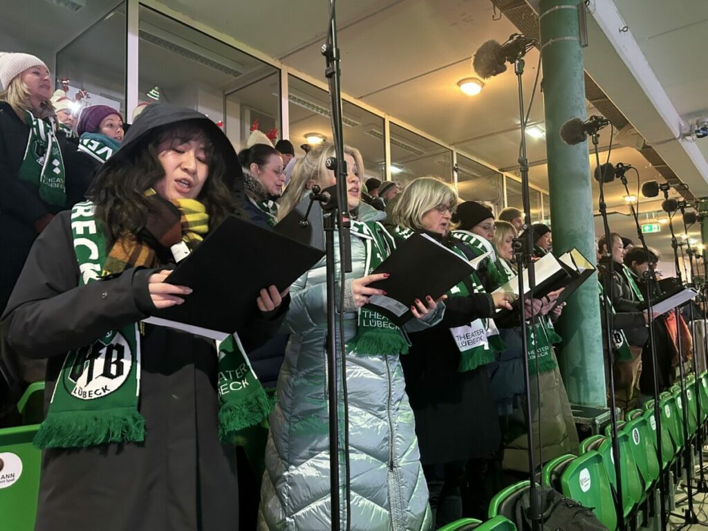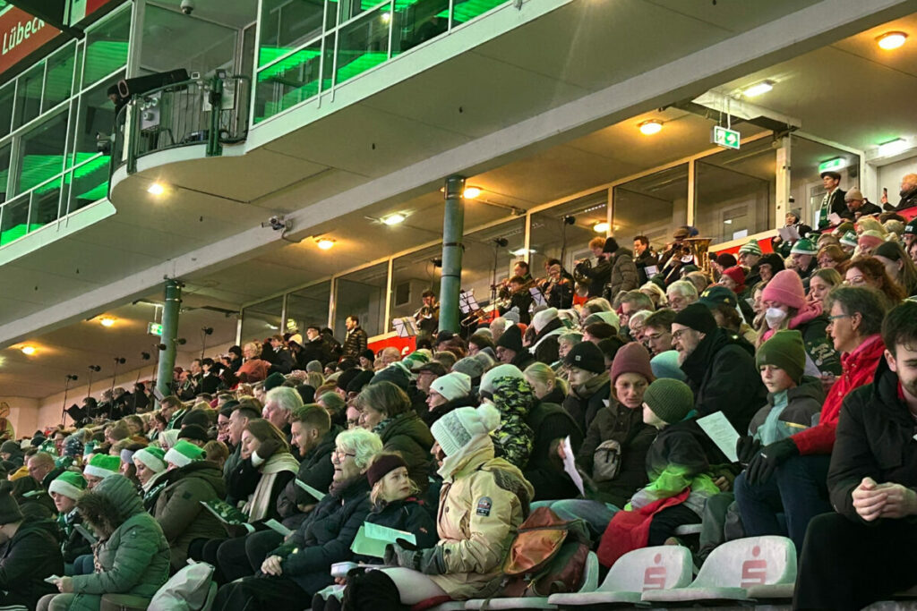 Lübeck – Bei „Oh, du fröhliche“ war alles schon vorbei. Aber bis dahin war alles super. Das dritte Adventssingen des VfB Lübeck und dem Theater Lübeck im Stadion Lohmühle war wieder ein voller Erfolg. Fast 3.000 Menschen kamen am Sonntagnachmittag und sangen viele Weihnachtslieder. Die Stadt-Prominenz ließ es sich nicht nehmen dabei zu sein.