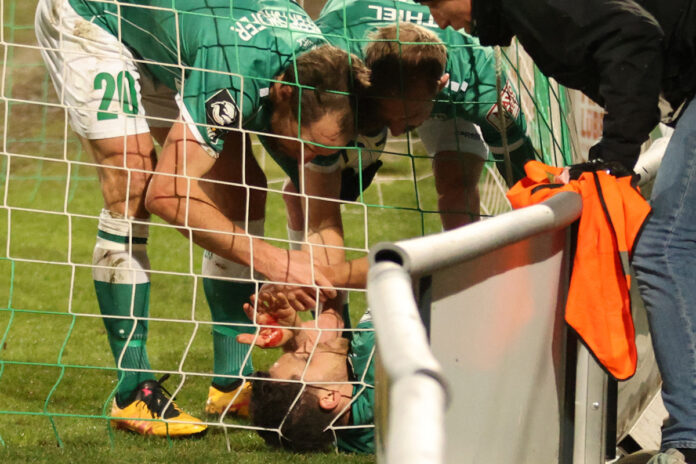 Der Jubel nach dem Treffer von „Bole“ verstummte allerdings schnell, da sich der 36-Jährige nach starkem Körpereinsatz verletzte, gegen den Pfosten knallte, behandelt werden musste und nicht weiter kicken konnte. Unter viel Applaus verließ der Dauerrenner und Kämpfer mit einem „Turban“ am Kopf letztlich den Platz. Inzwischen gibt es aber Entwarnung. Boland musste nämlich nicht, wie in einigen Medien zu lesen, ins Krankenhaus, sondern wurde von Dr. Ulf Seidel versorgt und genäht. „Ansonsten geht es ihm gut“, bestätigte auch VfB-Sportvorstand Sebastian Harms den „positiven“ Ist-Zustand des Lübecker Publikumslieblings.
