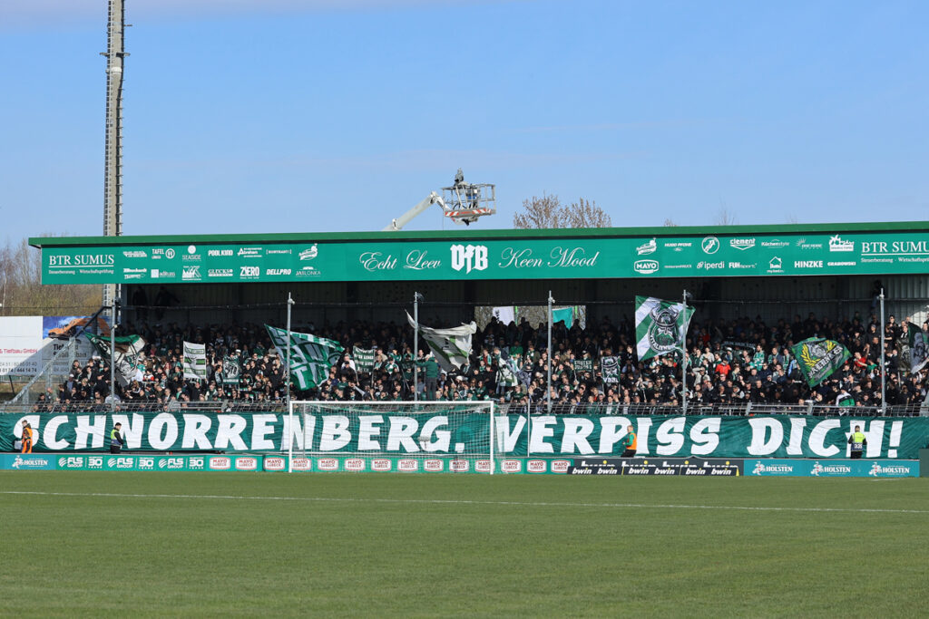 Schon vor der Partie äußerten die VfB-Fans aus der Pappelkurve den Unmut über den eigenen Trainer, „Schnorrenberg, verpiss dich“ war auf einem großen Banner zu lesen.