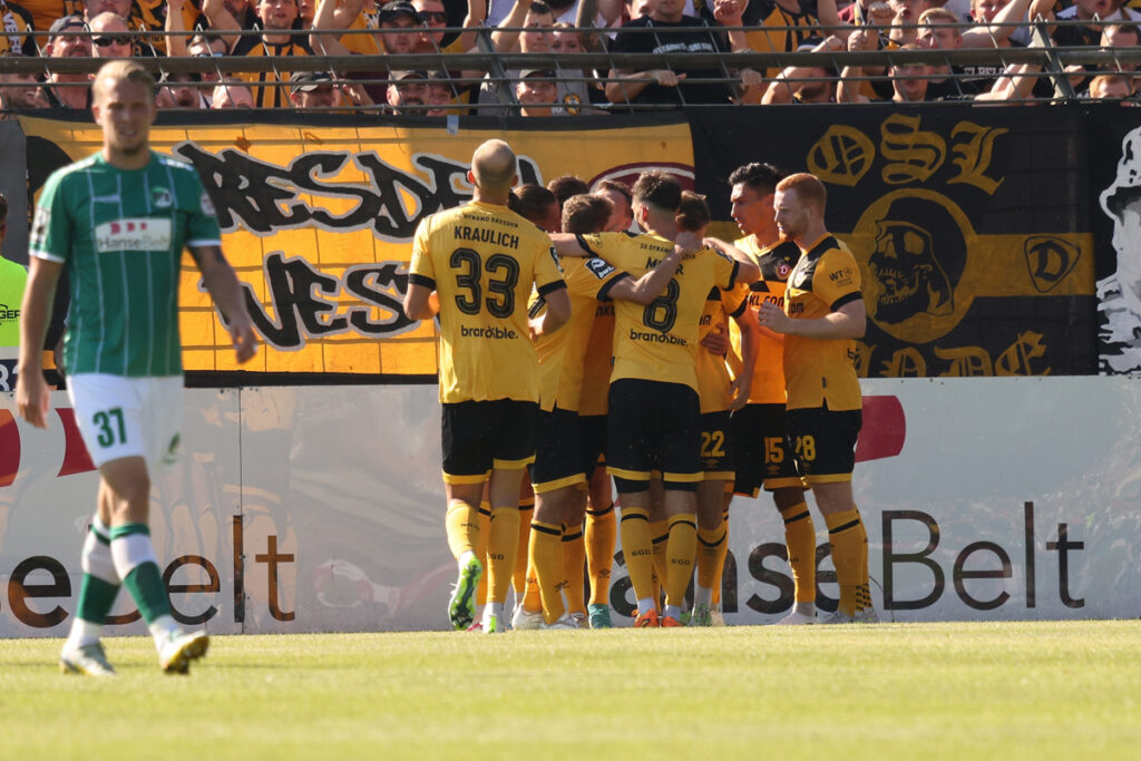 Die Dresdner kamen besser aus der Kabine und hatten auch gleich die erste Möglichkeit durch Kutschke, der als Abschluss eines Konters den Ball rechts am Tor vorbei setzte (46.). Dann probierte es mal Tarik Gözüsirin mit einem Schuss aus der Distanz, der nur knapp über das Dynamo-Tor strich (50.). Wie es besser geht, zeigten dann die Gäste. In der 51. Minute tanzte Jakob Lemmer seinen Gegenspieler im Strafraum aus und ließ Klewin mit einem platzierten Schuss ins lange Eck keine Abwehrmöglichkeit. Kurz danach setzte Luka Hermann zu einem Slolauf durch die Lübecker Abwehr an, Klewin blieb aber Sieger (57.). Das Duell der Brüder Hauptmann dauerte dann nur fünf Minuten. Während der Lübecker Marius in der 58. Minute eingewechselt wurde, musste sein Bruder Niklas angeschlagen vom Platz (63.). Der VfB blieb dran, und wie! Es folgte die stärkste Phase der Grün-Weißen. Zunächst scheiterte Facklam frei vor Drljaca (66.), dann hatten die Lübecker Fans bei einem Schuss von Mirko Boland (69.) den Torschrei schon auf den Lippen. Die Kugel ging aber knapp am langen Pfosten vorbei. Auch Pascal Breier scheiterte zweimal an Drljaca (70., 76.). Gözüsirins Schuss ging auch nur knapp am Giebel vorbei (77.) und auch Breier verfehlte das Tor nur knapp (79.). Die größte Gelegenheit zum Ausgleich hatte dann erneut Breier, der mit seinem wuchtigen Kopfball nach Flanke von Manuel Farrona Pulido am glänzend reagierenden Drljaca scheiterte. In der sechsminütigen Nachspielzeit traf Tommy Grupe per Kopf nach Flanke von Leon Sommer noch die Latte (94.). Glück geht anders! Sommer verzog den letzten Schussversuch (96.), danach war Schluss! Beide Teams wurden von ihren Fans mit viel Beifall verabschiedet!