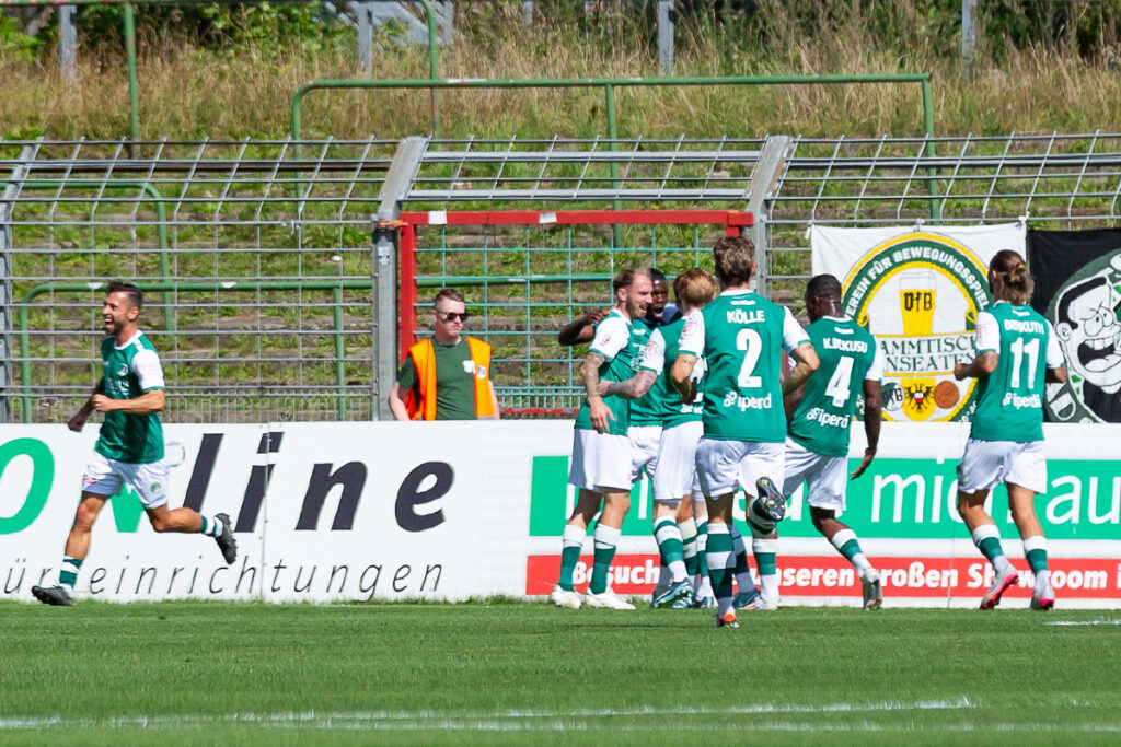 Die Anfangsphase gestaltete sich etwas zerfahren auf beiden Seiten. Die Mannschaften versuchten den Ball schnell nach vorne zu spielen, dabei fehlte aber die Genauigkeit. Ein Freistoßtrick brachte in der 11. Minute die Lübecker Führung. Manuel Farrona Pulido bediente Herdi Bukusu flach, der aus kurzer Distanz keine Mühe hatte, den Ball neben dem Pfosten ins Tor zu schieben. Auch in der Folgezeit blieben die Grün-Weißen tonangebend, bekamen aber die Quittung für eine sorglose Abwehrarbeit. Fritz Kleiner ließ im Strafraum seinen Gegenspieler stehen und bezwang Noah Oberbeck mit einem Flachschuss zum Ausgleich (18.). Nach einem katastrophalen Torwartfehler von Oberbeck, der unter einem aufspringenden Ball unterdurchsprang, drehte Nikky Goguadze mit einem Kopfball ins leere Tor die Partie (24.), was sich keineswegs angedeutet hatte. Das war erst einmal ein Wirkungstreffer für den Gastgeber, der Schwierigkeiten hatte, ein konstruktives Aufbauspiel zu betreiben. Nach einer Trinkpause waren die Grün-Weißen erneut unsortiert und kassierten den dritten Gegentreffer gegen keineswegs starke Gäste, erneut durch Goguadze mit einem Schuss ins lange Eck (36.). Die Fehlerquote der Gastgeber war einfach zu hoch. Probleme bereitete den Lübeckern auch die durchaus rustikale Gangart der Gäste, begünstigt dadurch, dass Schiedsrichter Jannik Weinkauf es immer nur bei Ermahnungen beließ. So brachten die Gäste das Ergebnis in die Pause.
