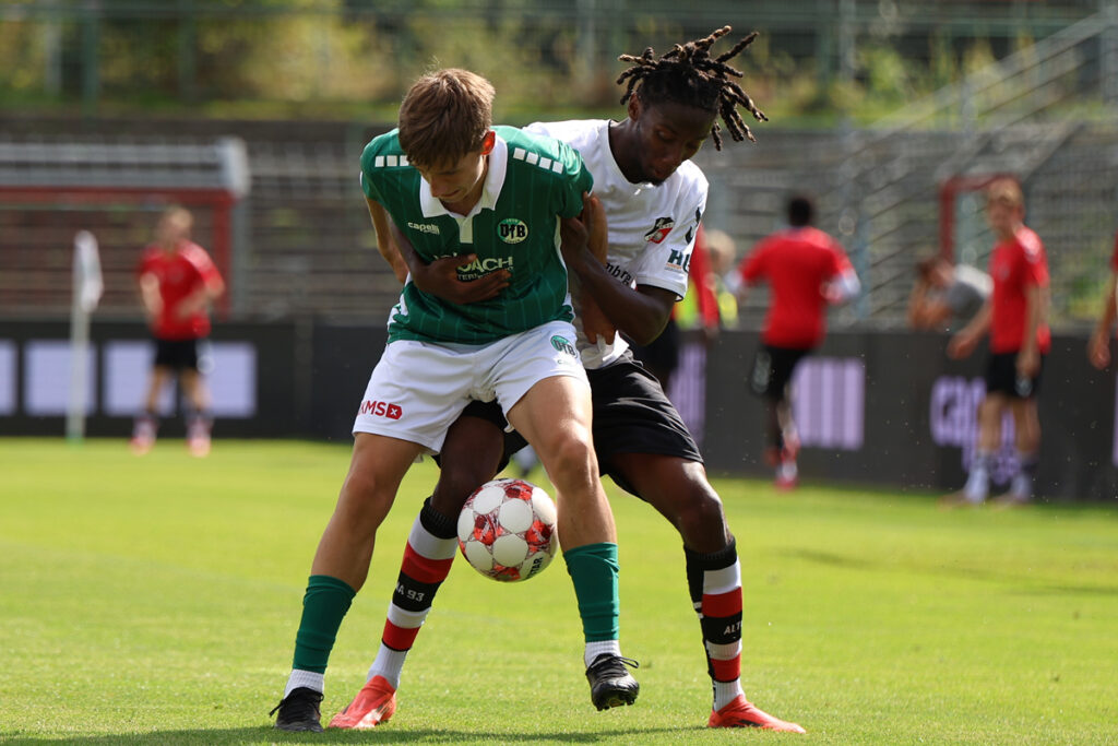 Die Anfangsphase begann mit leichtem Abtasten. Die erste Torannäherung hatten die Gäste in der 4. Minute mit einem zu hoch angesetzten Distanzschuss. Das Mittel versuchten auch Manuel Farrona Pulido und Julian Albrecht, blieben aber in der Deckung hängen (8.). Brenzlig wurde es für die Grün-Weißen, als ein Schuss von Rasmus Tobinski aus aussichtsreicher Position sein Ziel nur knapp verfehlte (14.). Zwei Minuten später verzog er erneut knapp. In dieser Phase des Spiels erarbeitete sich Altona 93 leichte Vorteile und kam dann auch zur Führung. Die VfB-Defensive war unsortiert und Lesley Karschau nutzte dies mit einem Schuss ins lange Eck (24.). Eine entschlossene Einzelleistung von Kapitän Marvin Thiel brachte den Ausgleich (32.). Gut von Bjarne Pfundheller angespielt, zog er über die linke Seite in den Strafraum und schloss mit einem strammen Schuss unter die Latte ab. Und Fabian Istefo hätte fast nachgelegt. Von Farrona Pulido angespielt landete sein Schuss über dem Tor (34.). Danach beruhigte sich die Partie etwas. Bis zum Halbzeitpfiff von Schiedsrichter Mika Jungclaus passierte nichts nennenswertes mehr.