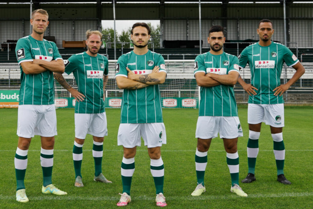 Stadt, Sponsoren, Verein, Fans, Nachwuchs – sie alle haben das neue Trikot der Grün-Weißen bereits in die Hand bekommen und für gut befunden. Bürgermeister Jan Lindenau, Konsul Bernd Jorkisch und Malvin Neugebauer von Trikotpartner HanseBelt, VfB-Ehrenspielführer und Rekordspieler Jürgen Brinckmann, Capo Julian aus der Pappelkurve und einige Nachwuchskicker aus dem VfB-Feriencamp sind die Personen, die die Ehre hatten, das neue Trikot aus den Händen der Spieler Tommy Grupe, Cyrill Akono, Robin Kölle, Marvin Thiel und Tarik Gözüsirin entgegenzunehmen.